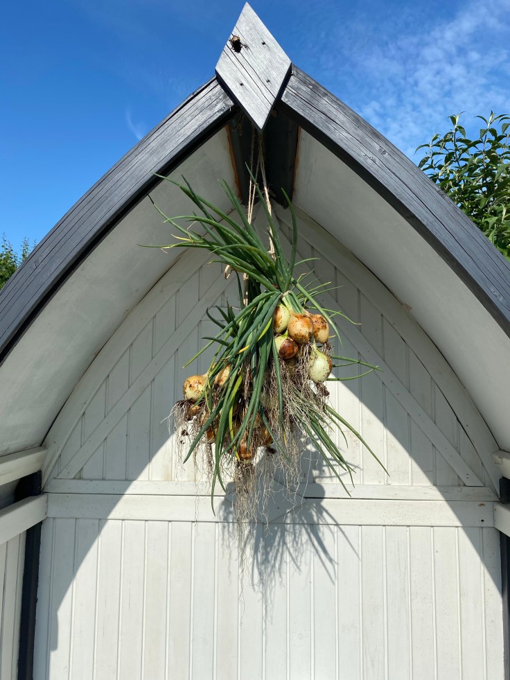 We’ve hung them in our arbour (tops and roots still attached) to dry out. Once they’re dry we can store them indoors to use throughout the winter – if they last that long that is!