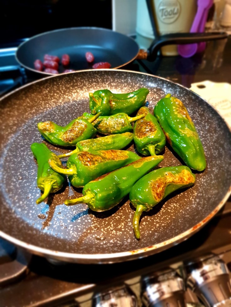After washing the padrons and drying them off, we fried them off in a little hot oil in a frying pan until they were blistered all over.