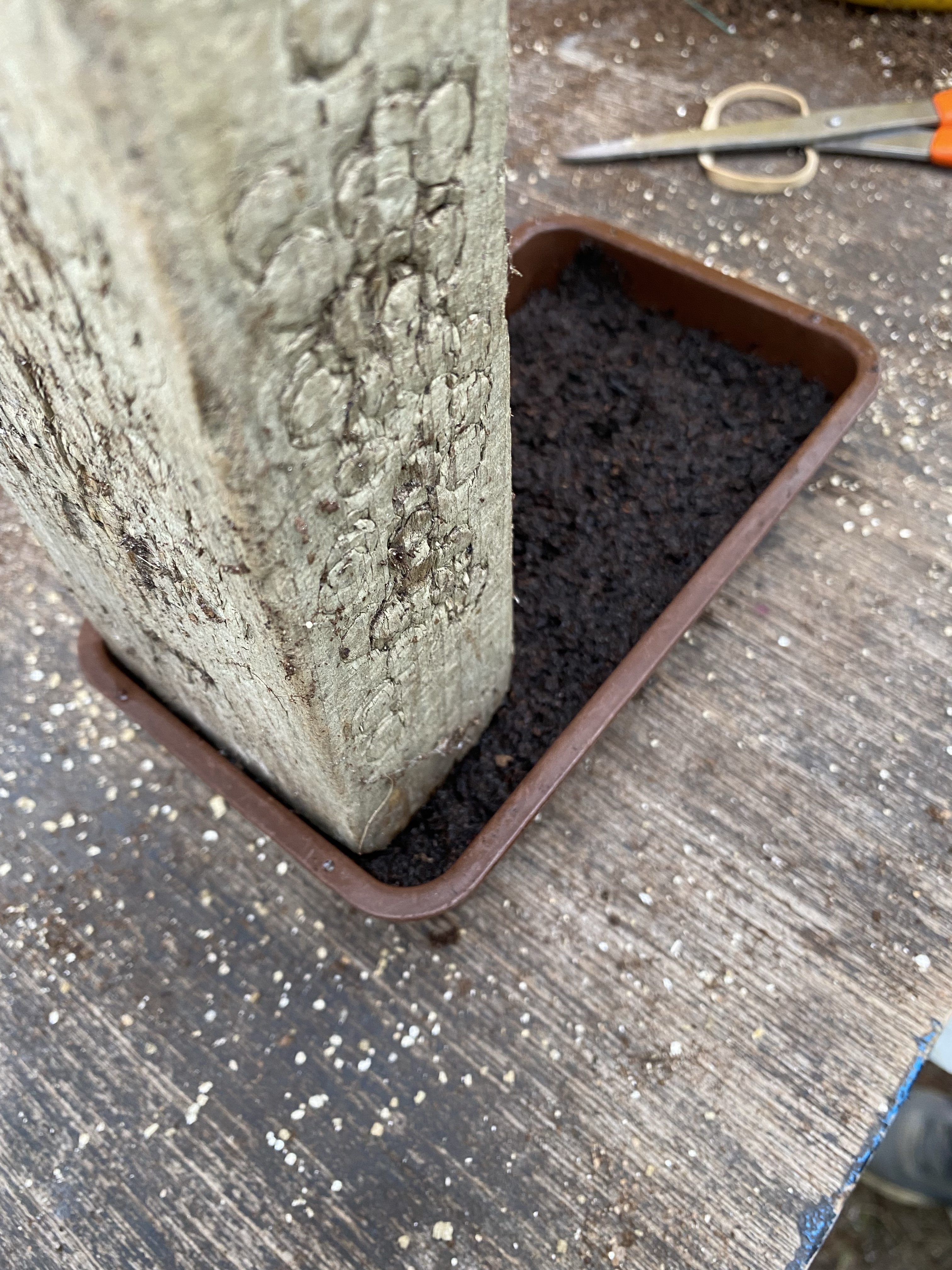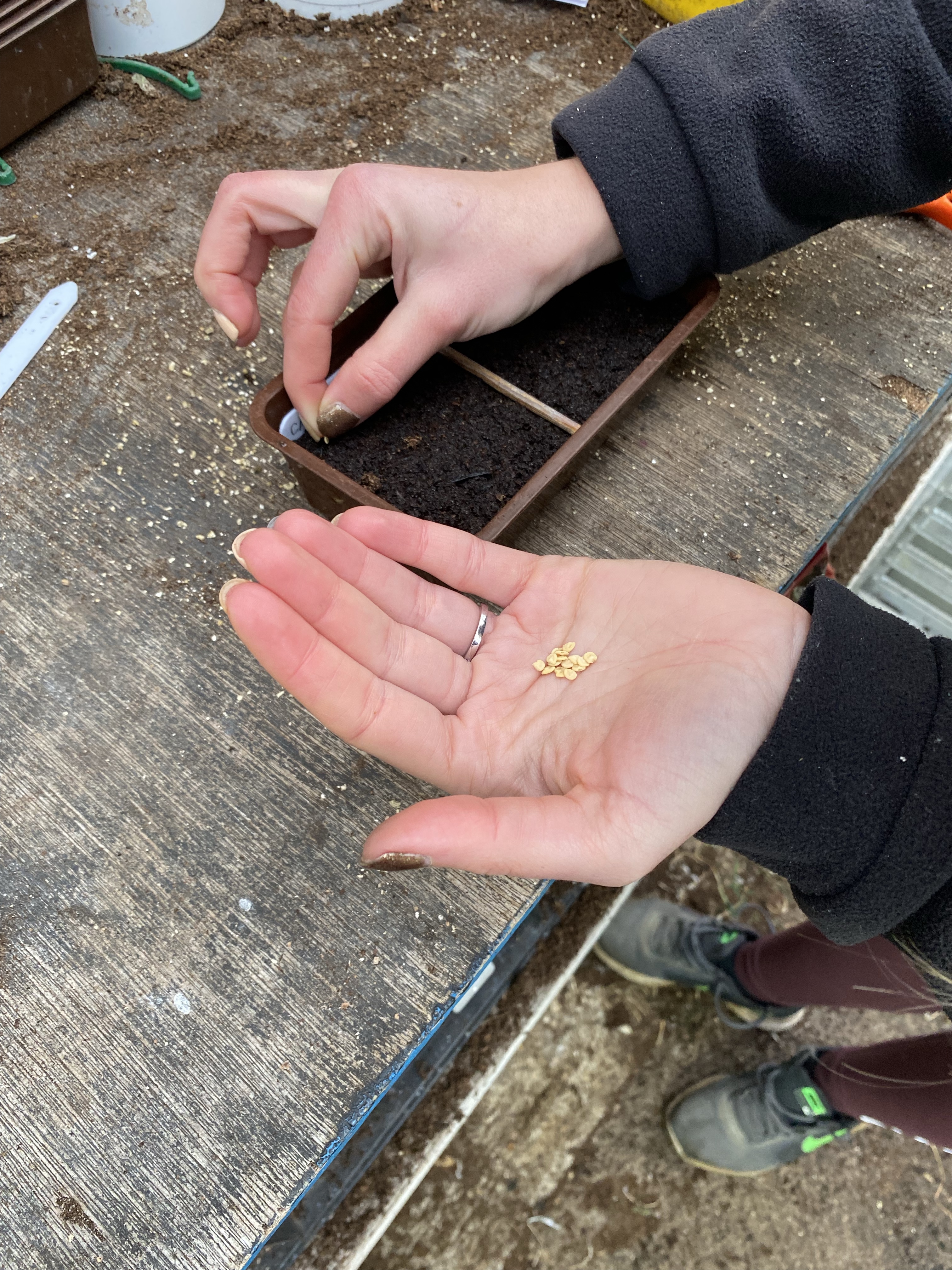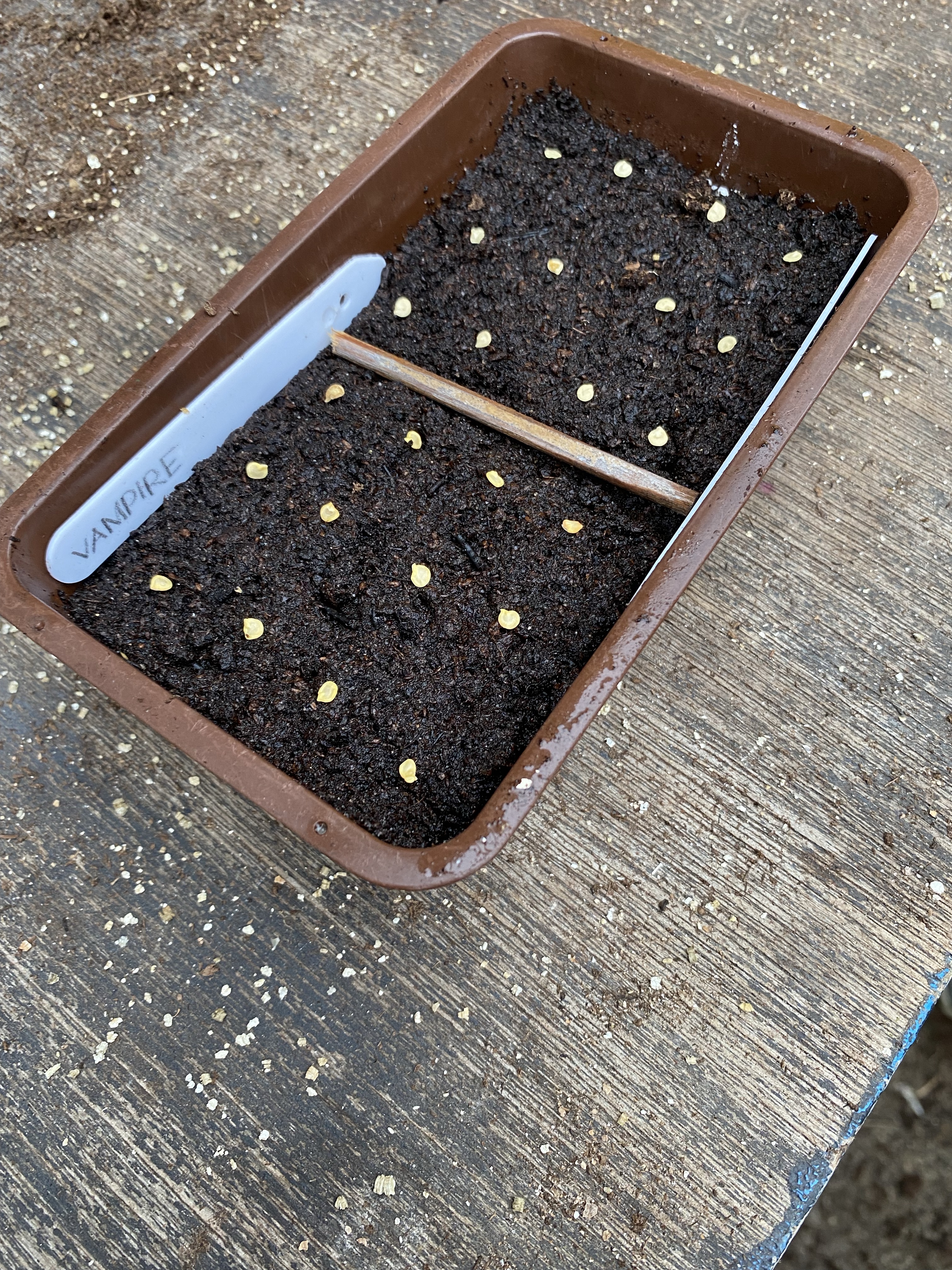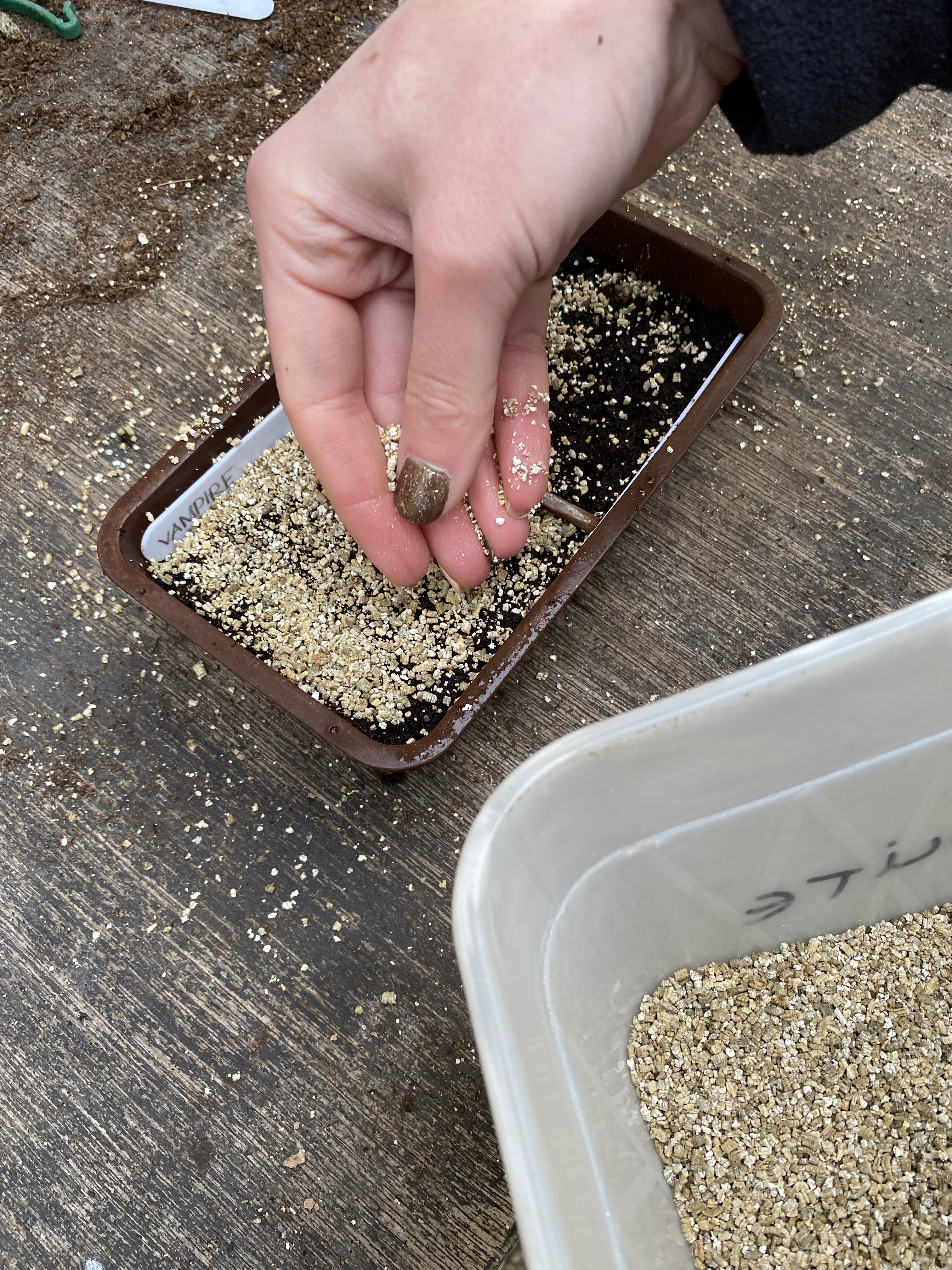 Before covering, we used a seed label to gently push each seed slightly into the compost so it sat in its own little indent. Following this, we covered with a fine covering of vermiculite to exclude the light whilst the seeds germinated. Although not for all, the vast majority of seeds need the light to be excluded in order to germinate.