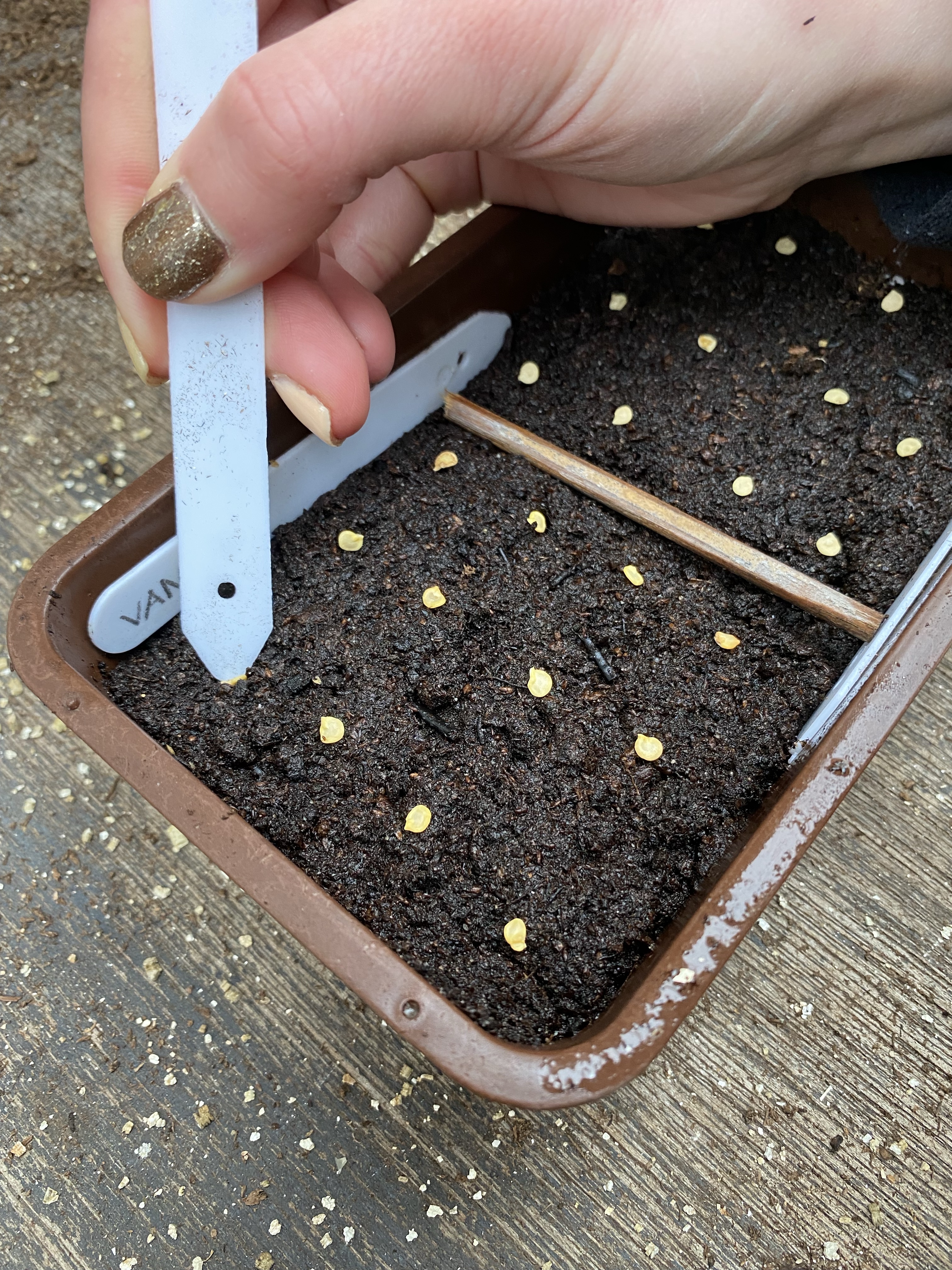 Once the seed trays are prepared, it’s time for the fun bit – sowing the seeds themselves! As we’ve mentioned before, we prefer to place the seeds in the seed tray as we go along, rather than scattering them willy-nilly and then having a real struggle to separate the seedlings when it comes to pricking out. As we only wanted to sow a few seeds of each variety, we split the seed trays in half using small canes as separators and then placed our seeds (and their respective name labels!) at either end.