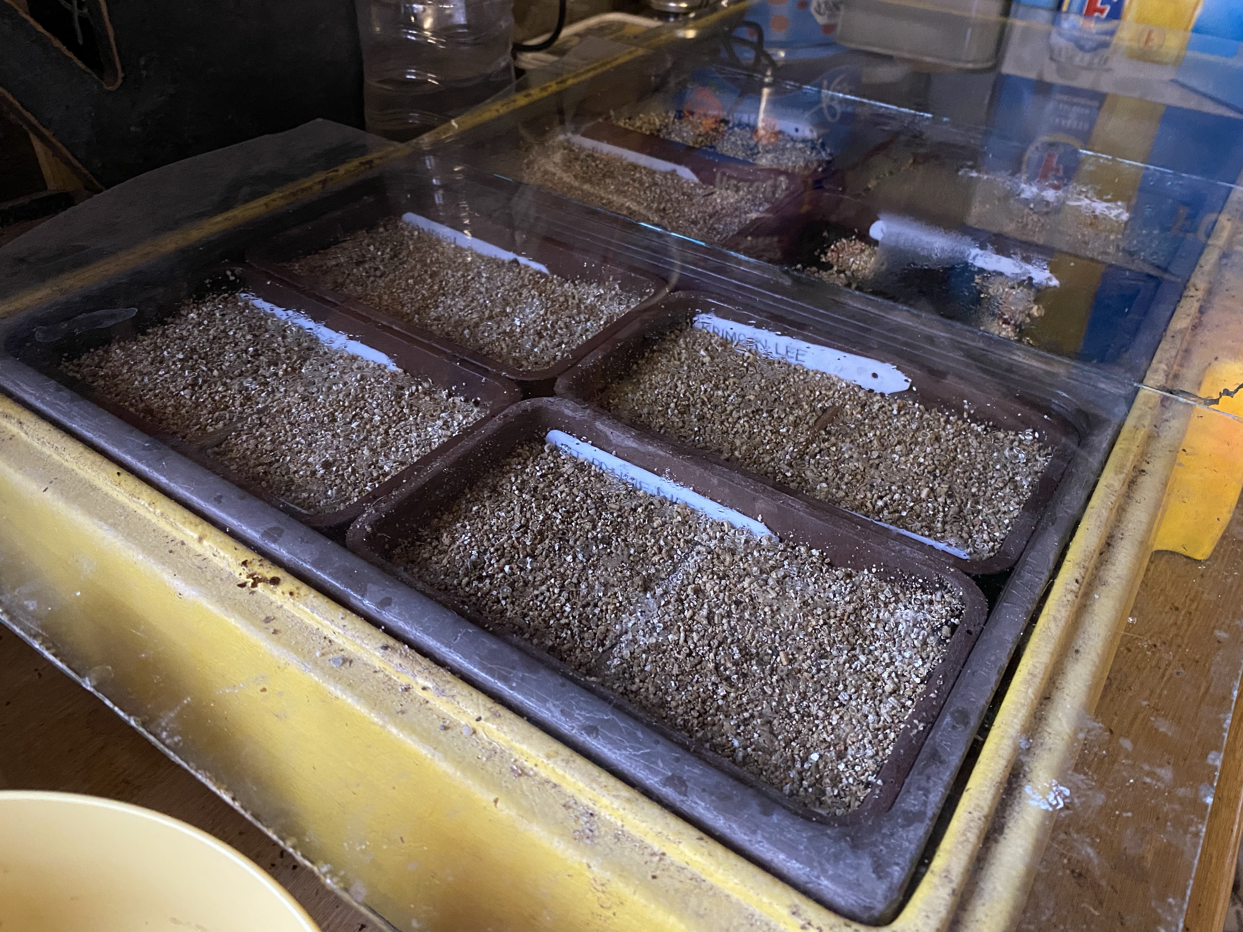 As we were sowing peppers, these require some heat in order to germinate. Therefore, we placed them on the propagator under some sheets of glass and covered in old newspaper to further exclude the light. It will be a little while (up to 2 weeks) before they germinate we’d estimate, but we’ll keep you updated! We will check the seed trays under the propagator every day or so in the meantime though to check the seeds haven’t germinated, and also to spray with a fine mist of water if the compost looks to be drying out.
