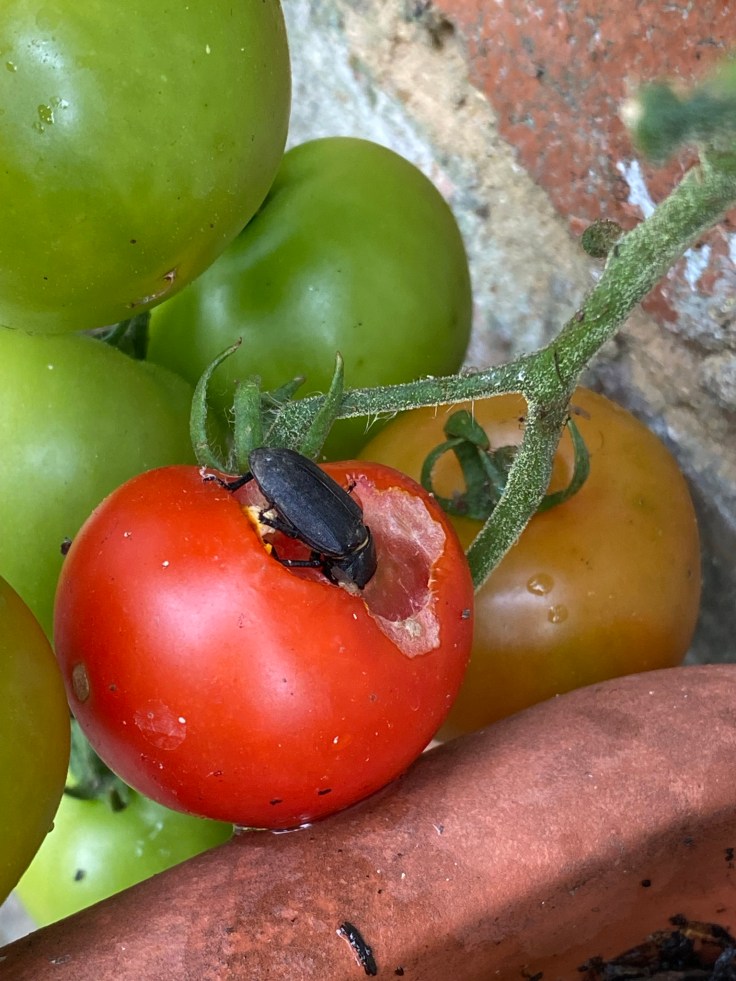 It wasn’t just our slimy garden fiends that were after a bit of our tomatoes though. It turns out that stag beetles rather like them too. This was another little pest that I found in one of the tomatoes one morning. It’s not clear whether the beetle made this hole, or whether it was an opportunistic beetle that came in after a snail had started the job. However, the type of hole seemed different to us, so we think there is a possibility that it was the stag beetle! I suppose we’ll never know unless we catch one red-handed next year!