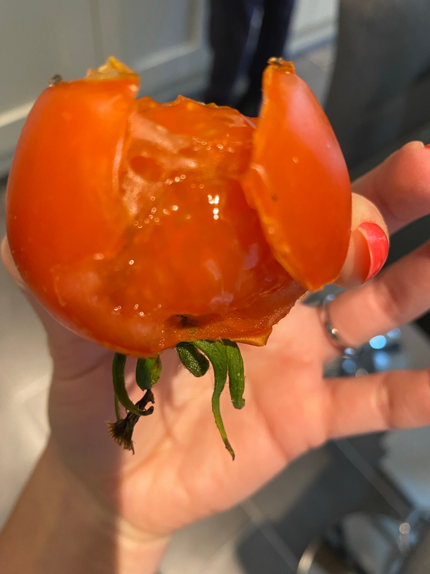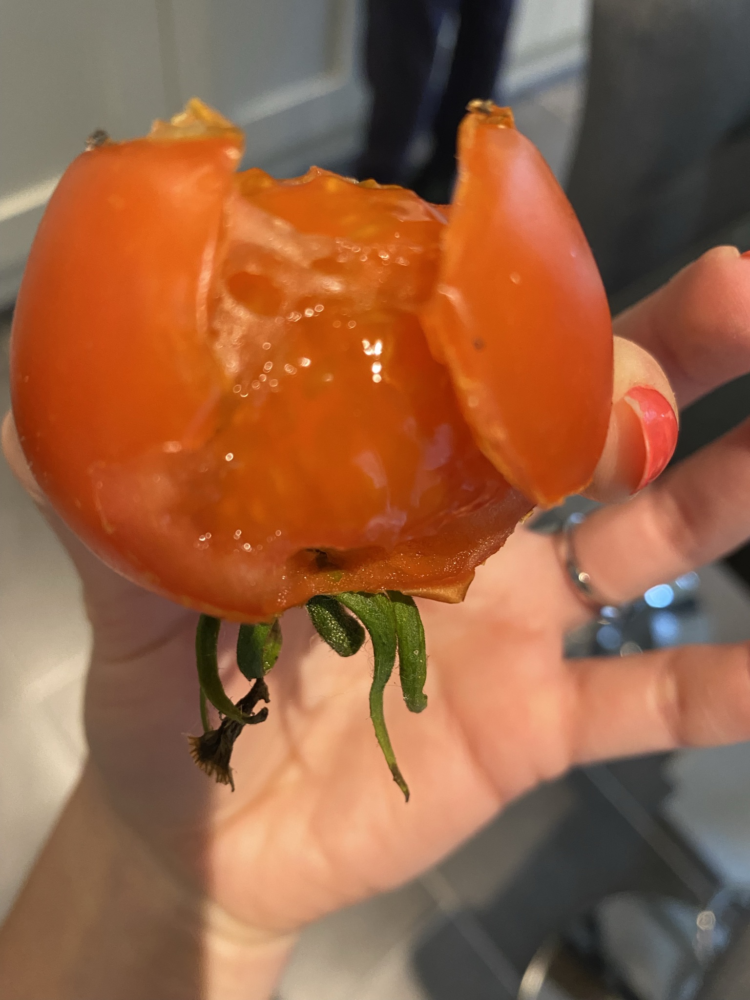 Last year, we learned that slugs and snails are rather partial to ripening tomatoes. In fact, a common garden snail can literally decimate a salad sized tomato overnight. The below photos show one of (unfortunately many) tomatoes we lost to slugs and snails in 2021. The most frustrating thing was that they never finished one tomato before they started on the next! And like birds with fruit, they always get there just before you consider its fully ripened, and so just before you’re about to pick them.