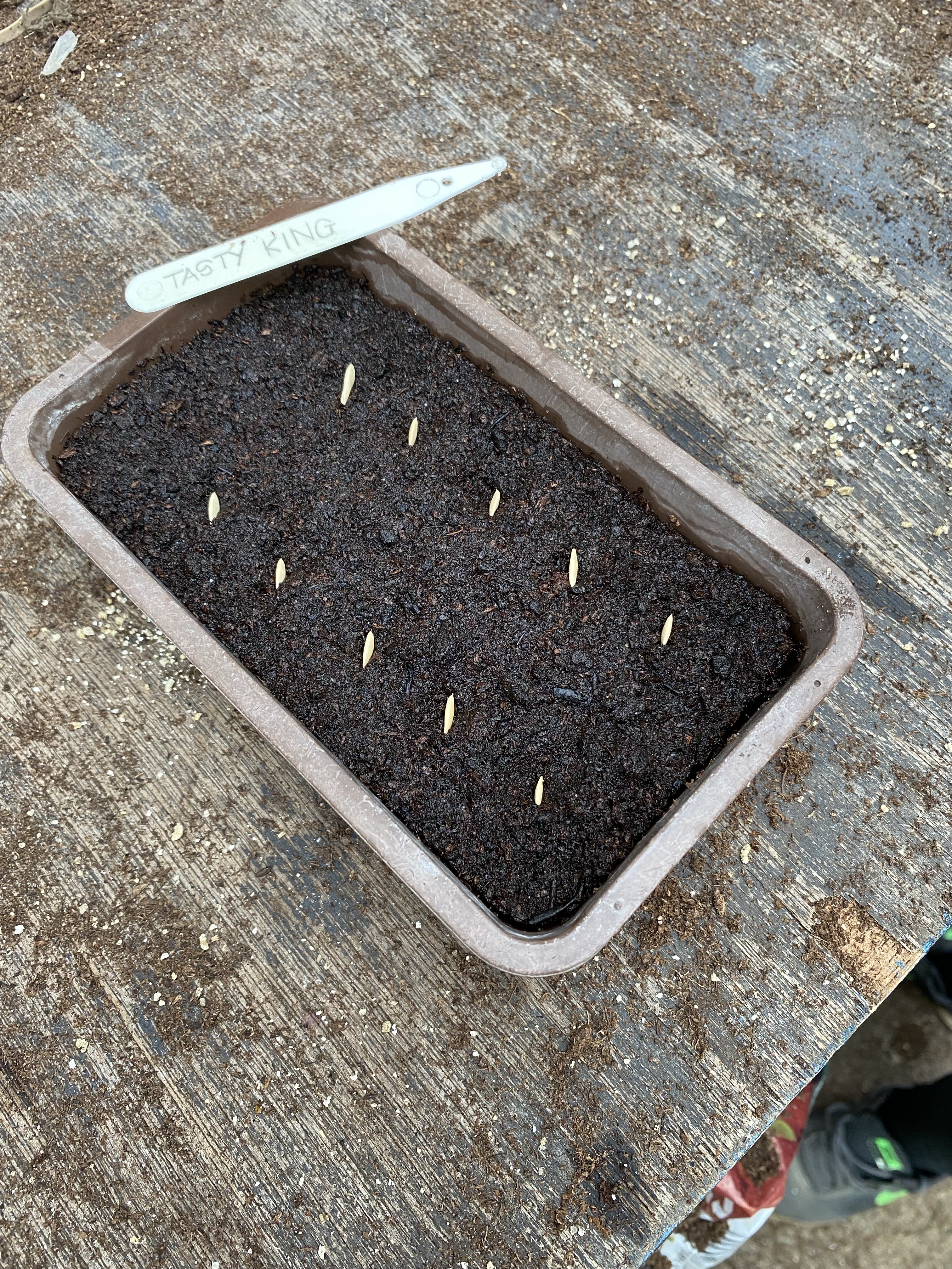 The first of these sowings were Tasty King cucumbers. These are a great variety that we’ve been growing for a number of years. They can be grown both indoors and outdoors, although if these ones germinate, they will be grown indoors as it will be too cold outside for them when we’re hoping to grow them on and get them producing early cucumbers for us.