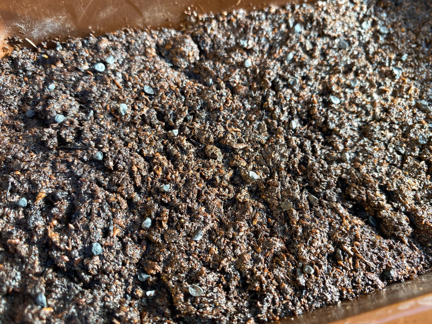 As with most things we sowed, these were sown in 1/4 seed trays. Onion seeds are quite small and don’t show up well against the compost, however we try and space them as well as we can using a plant label to move them around.