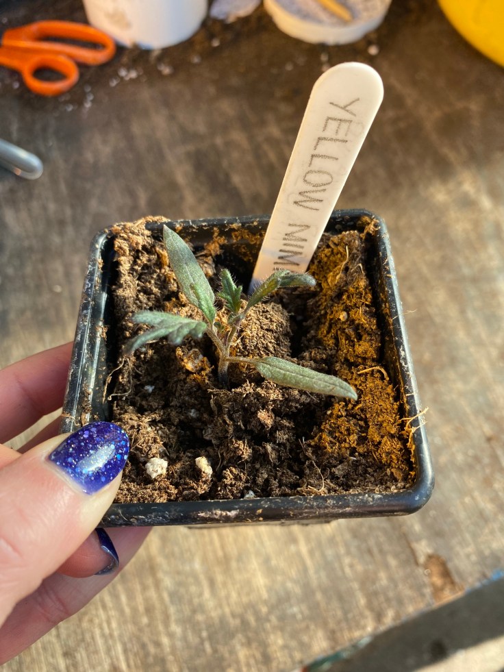 The Yellow Mimi tomatoes are growing pretty rapidly. This first photo was taken on Saturday 29 January. This was just before we potted them up into 3″ square pots in multipurpose compost.
