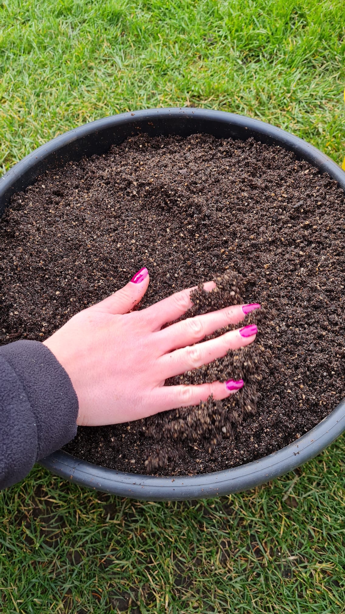 The variety we like growing is Red Ideal. First up we filled our 30 litre container with some multipurpose compost, with some finer seed sowing compost scattered on top. We then gently pressed the compost down to create a more even surface for the seeds to be sown on.