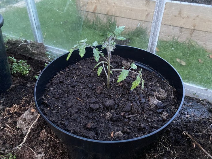Having patiently waited until the plants had flowers starting to form in their centres, they were ready to be potted on to their final pots. We wait until the tomatoes are starting to form flowers to try and maximise the number of trusses of tomatoes we get from our plants. Where you don’t do this before potting them on, you can sometimes find that the tomato spends all its time and energy growing a really big plant, but not producing any flowers. Without flowers, there are no fruits!