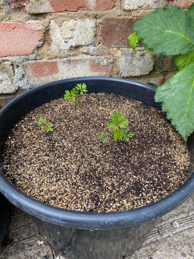 As with the other carrots, we moved these outside last weekend to grow on where it’s a bit cooler. you’ll notice that some of the vermiculite has been disturbed in the left hand container. This was down to ants. When I lifted the pane of glass one day, just as the carrots had germinated, I found that lots of the compost had been pushed upwards as the ants were starting to create a nest in the container. For the good of our carrot crop, we had to put a stop to the ants and luckily it seems like the carrots haven’t been too badly affected.
