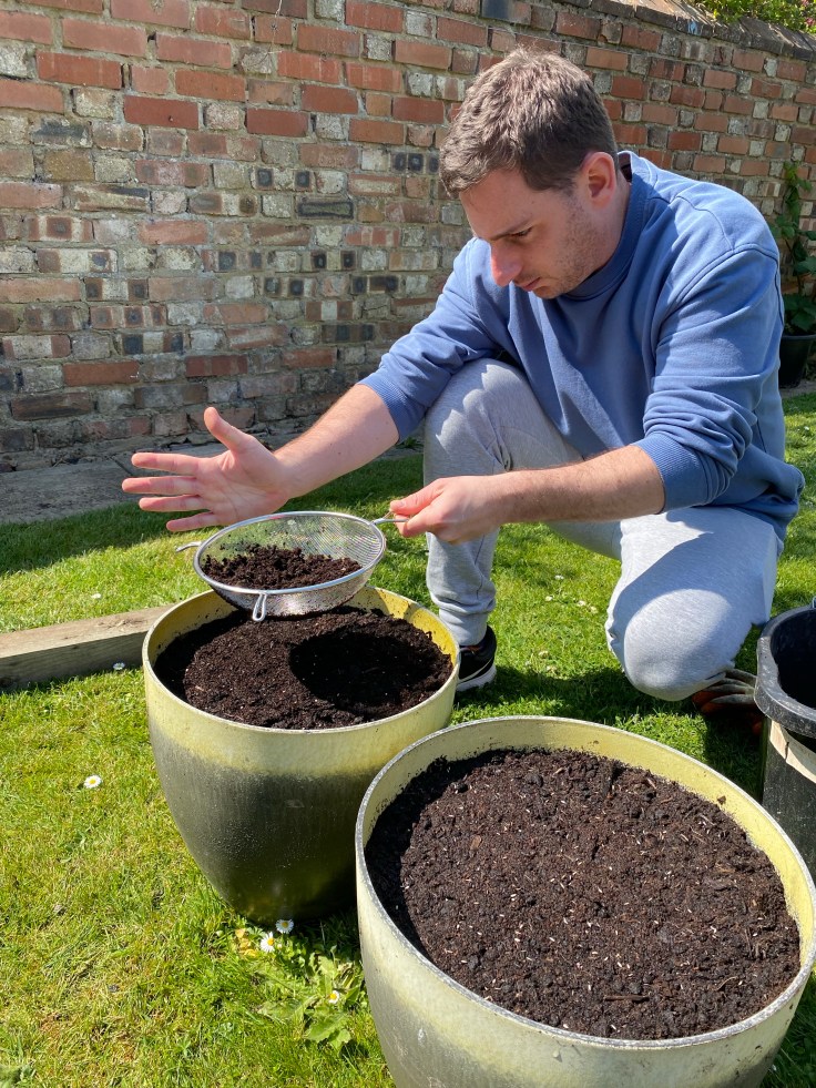 First up, Chris was sowing some Rougette radishes and some mixed leaf salad in containers. These are sown in multi-purpose compost and then covered with some sieved compost to exclude the light whilst the seeds germinate.
