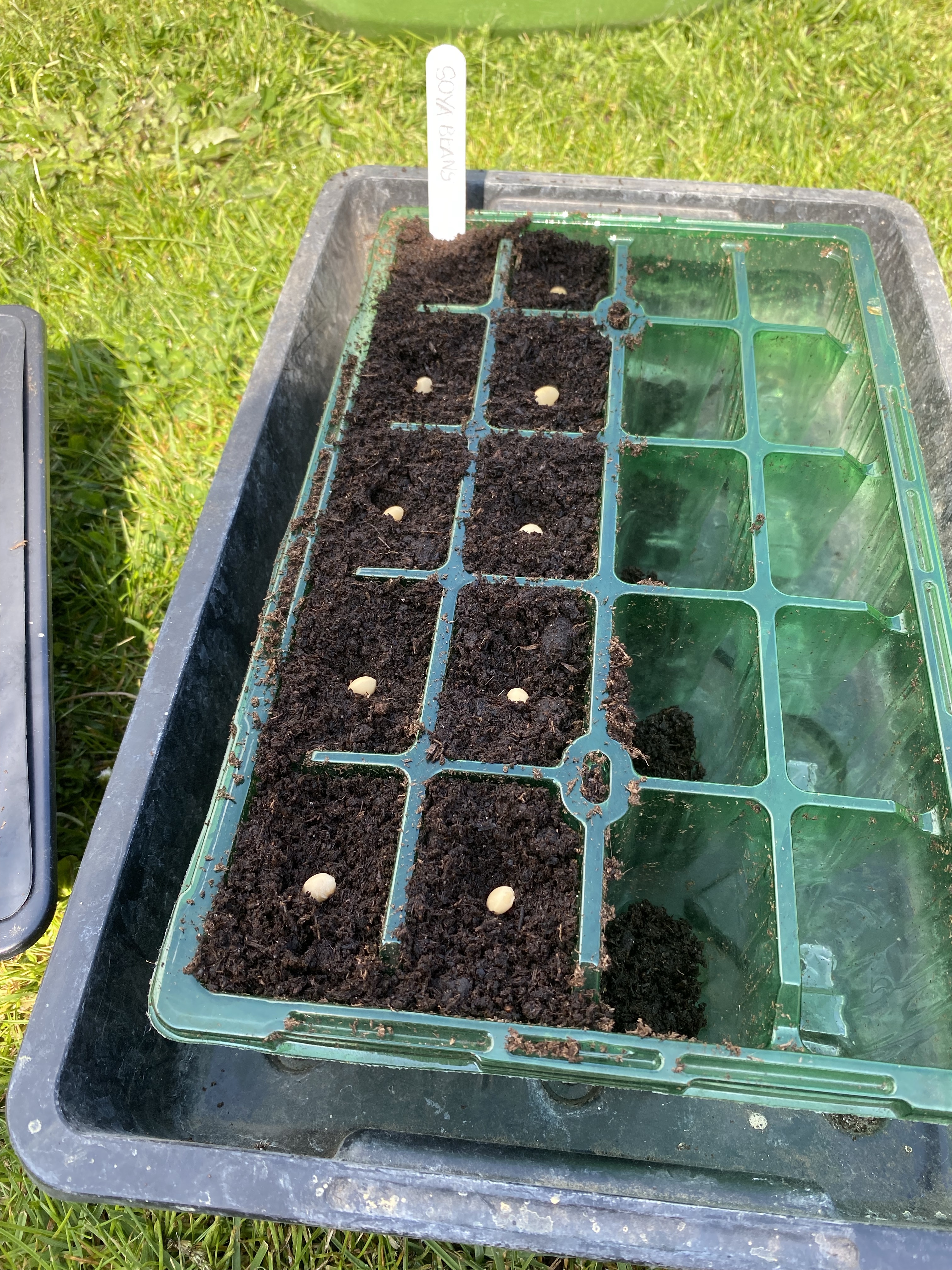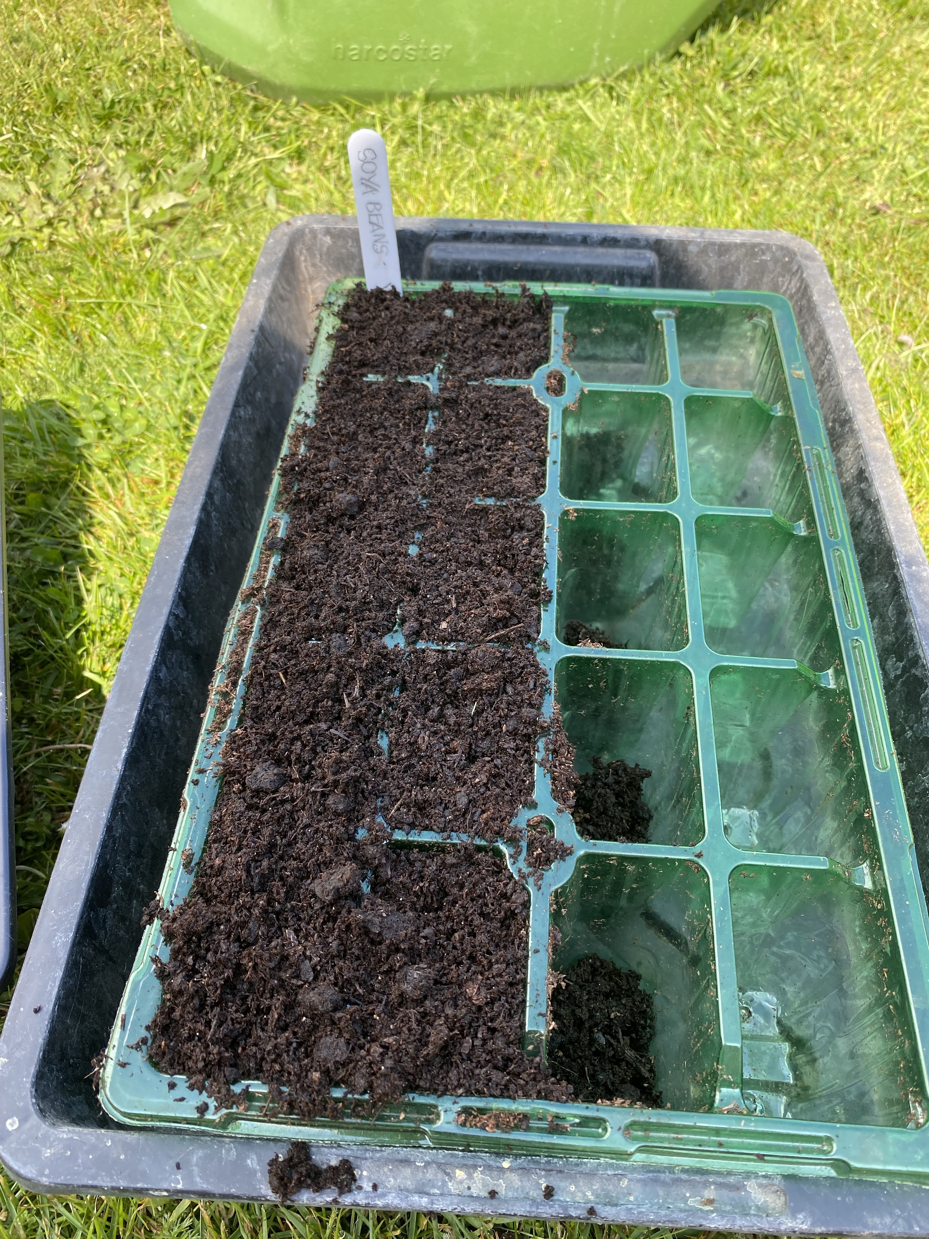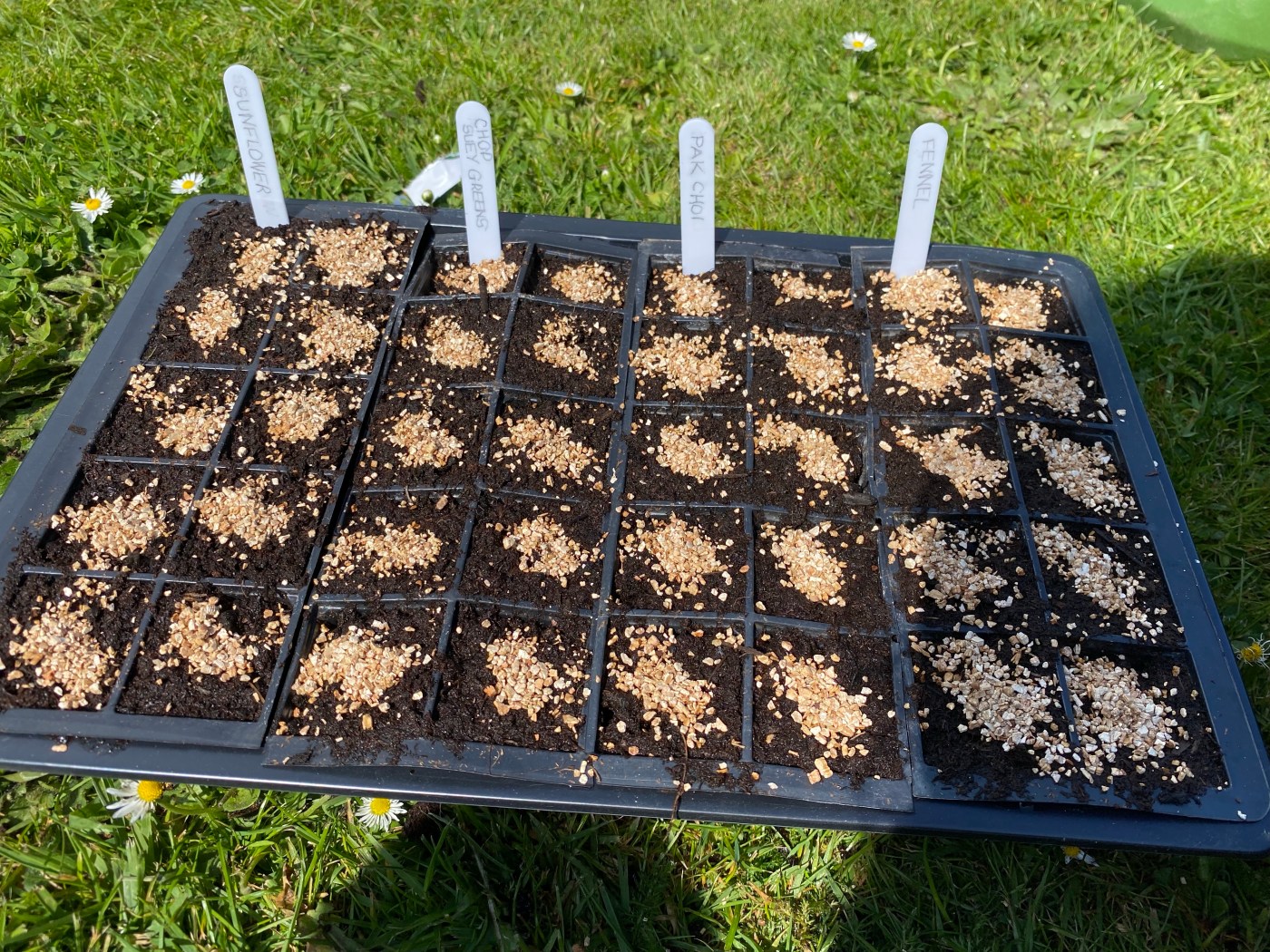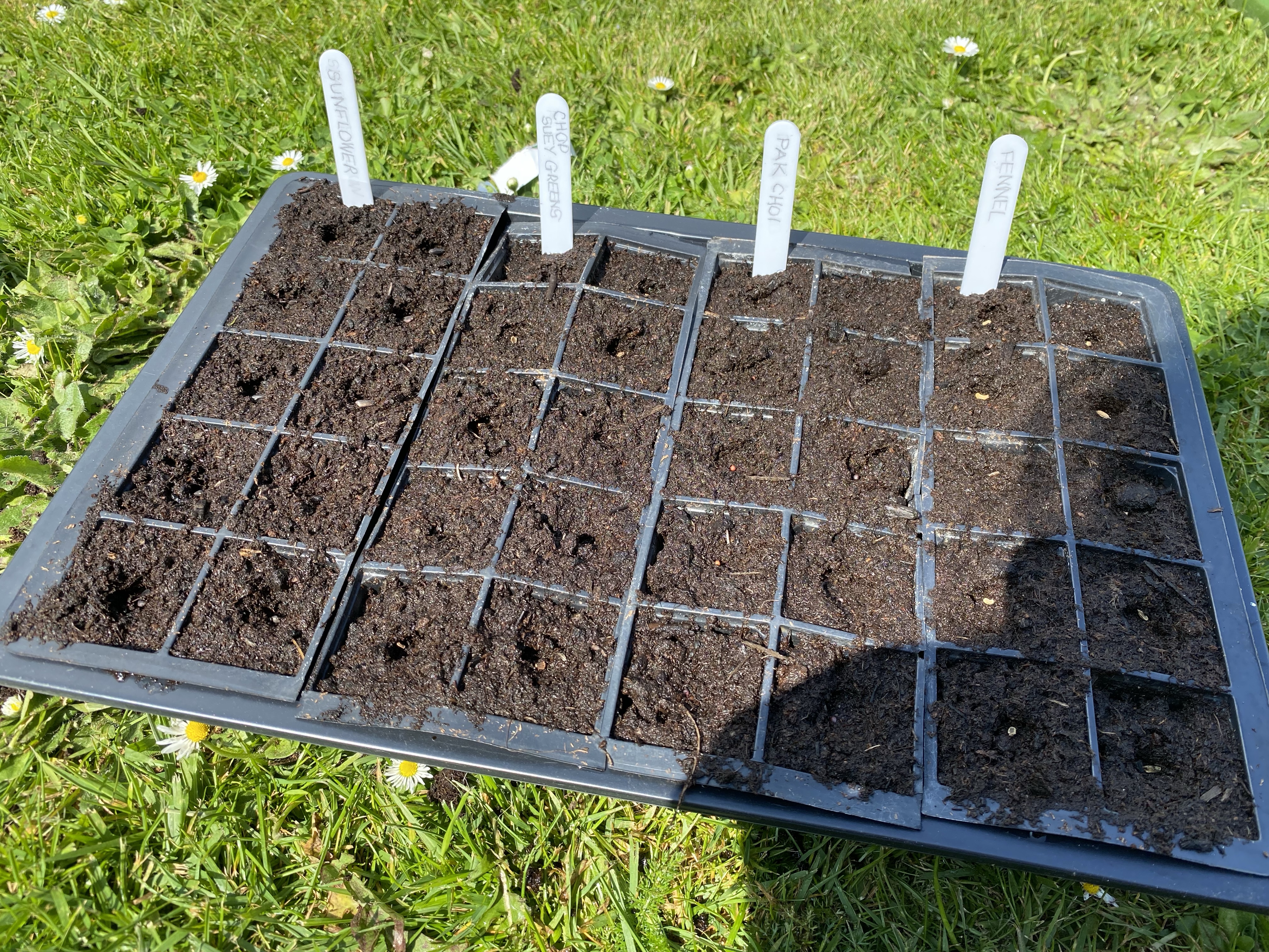 I was in charge of: sunflowers, chop suey greens, pak choi, fennel and soya beans. I filled the cell trays with multi-purpose compost and labelled each cell tray to avoid any confusion later down the line.