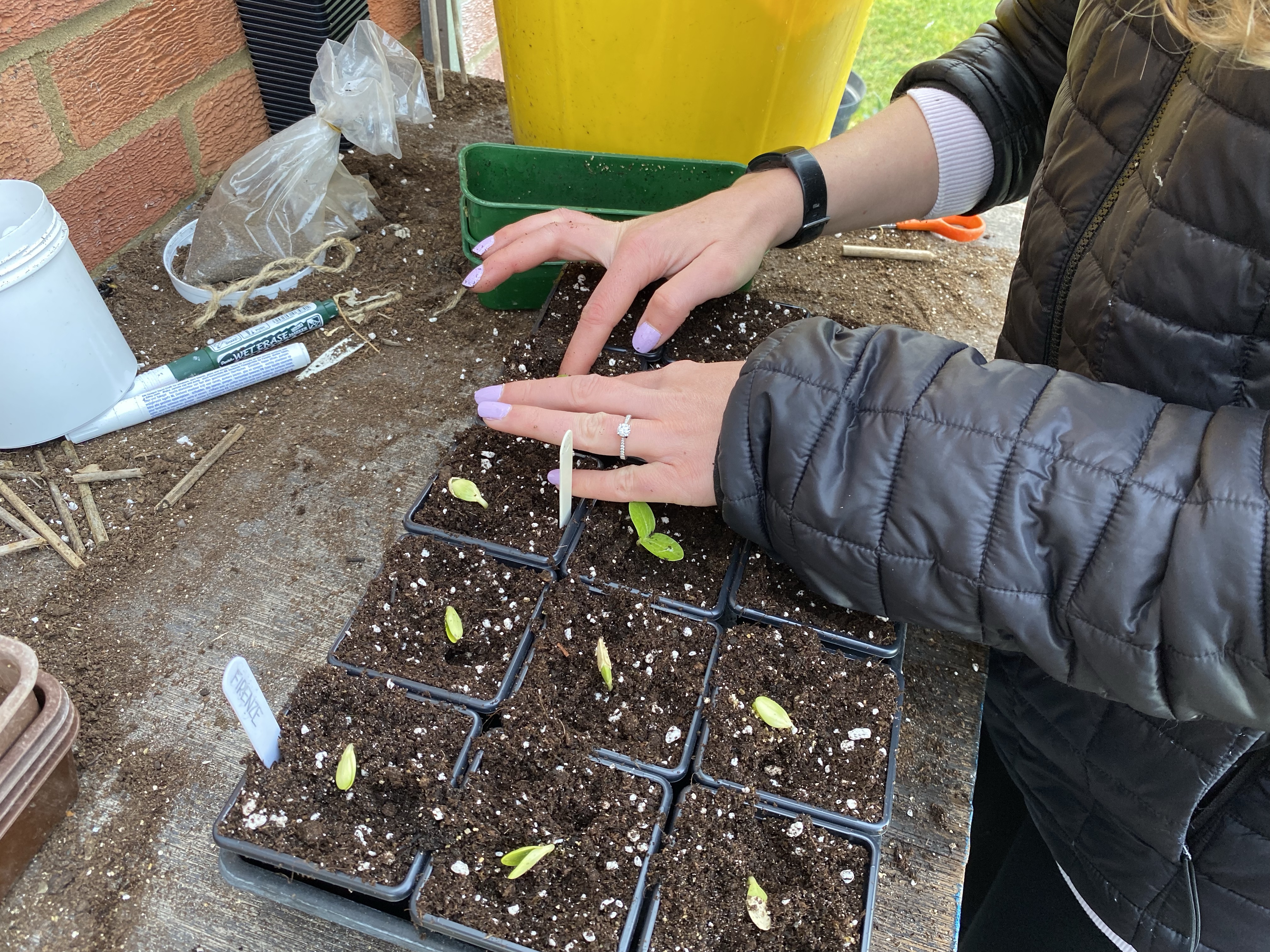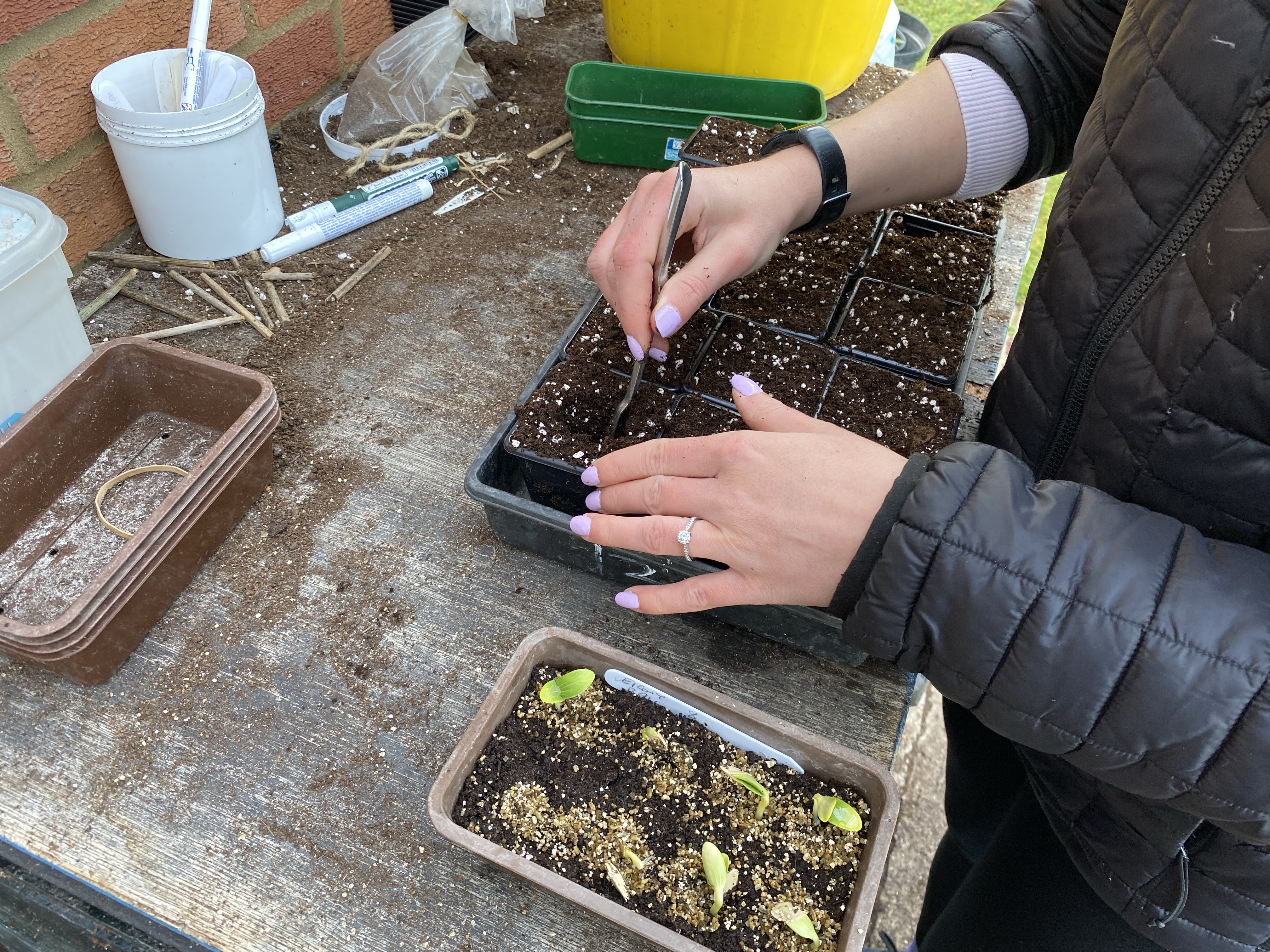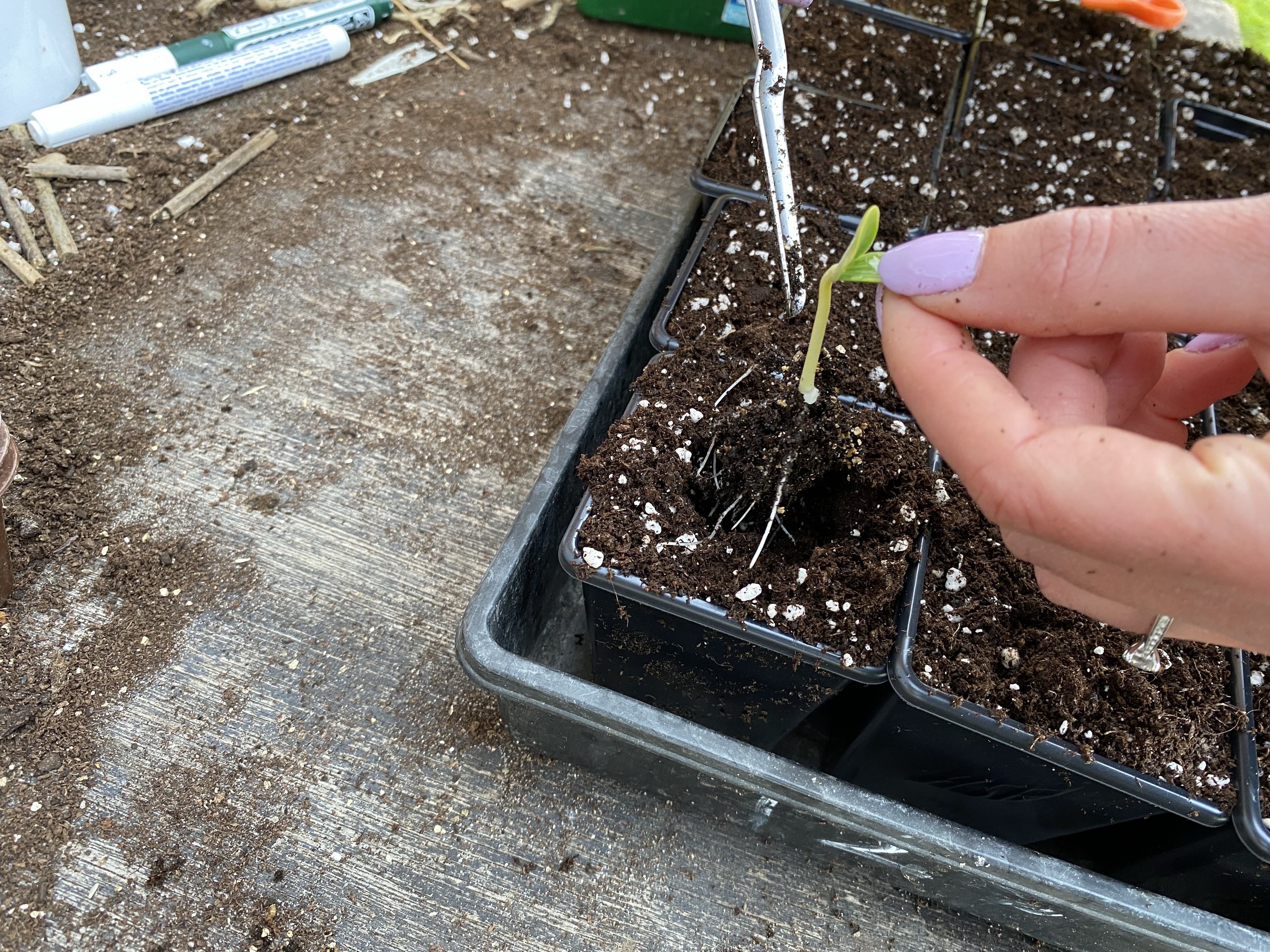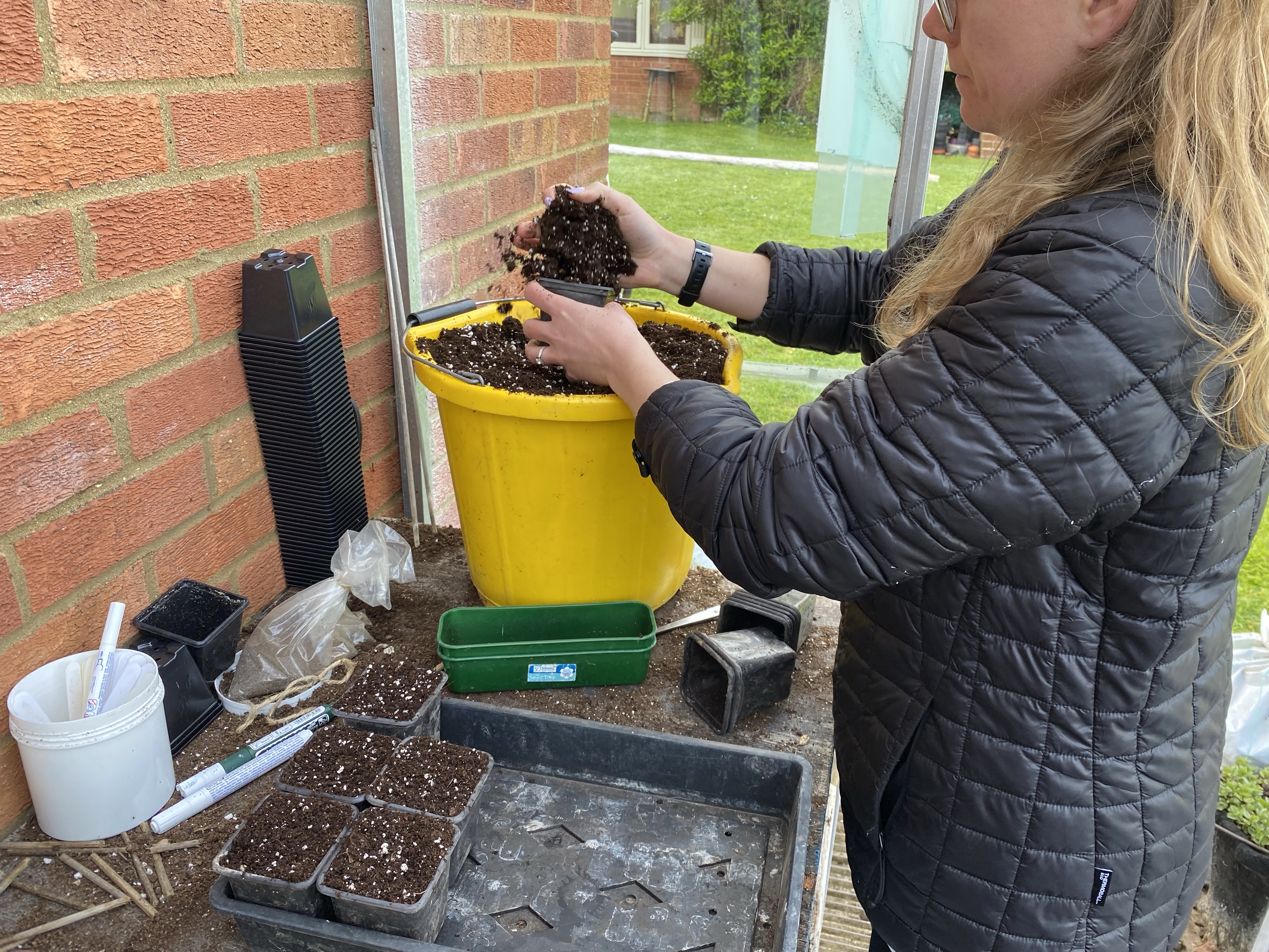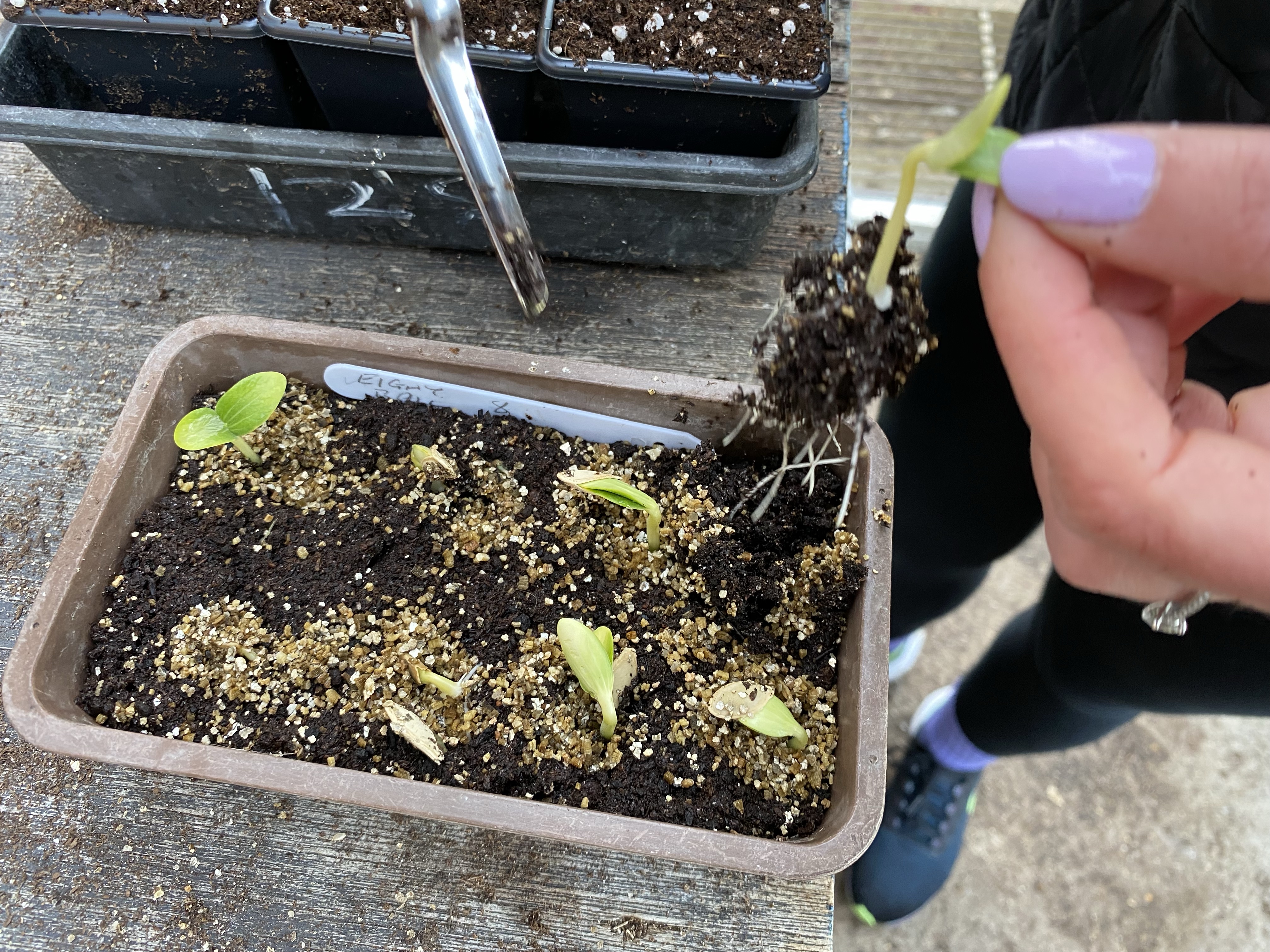 Here I am pricking the seedlings out into 3″ pots in multipurpose compost. The plants will grow on in thes until they are ready to plant out.