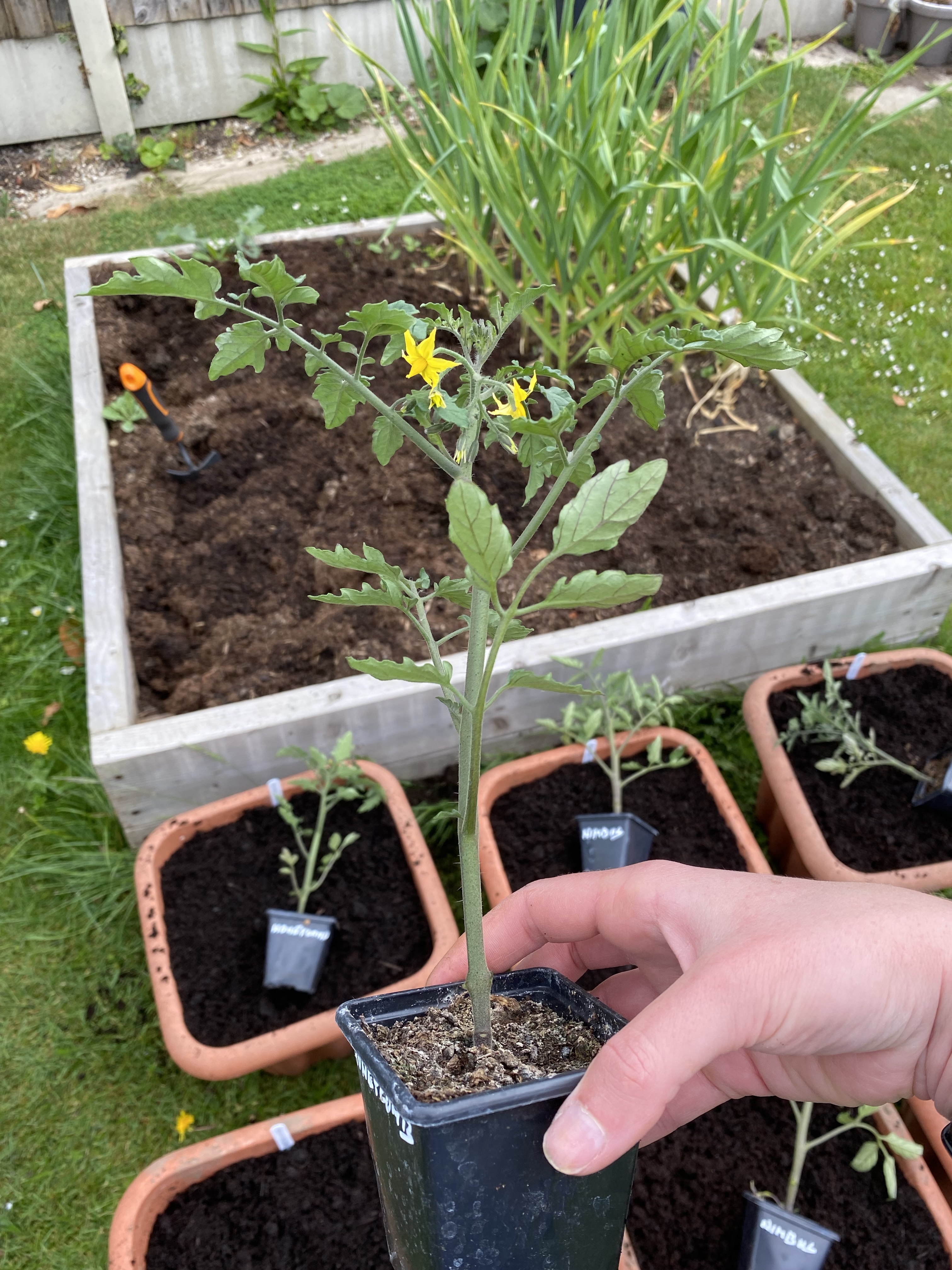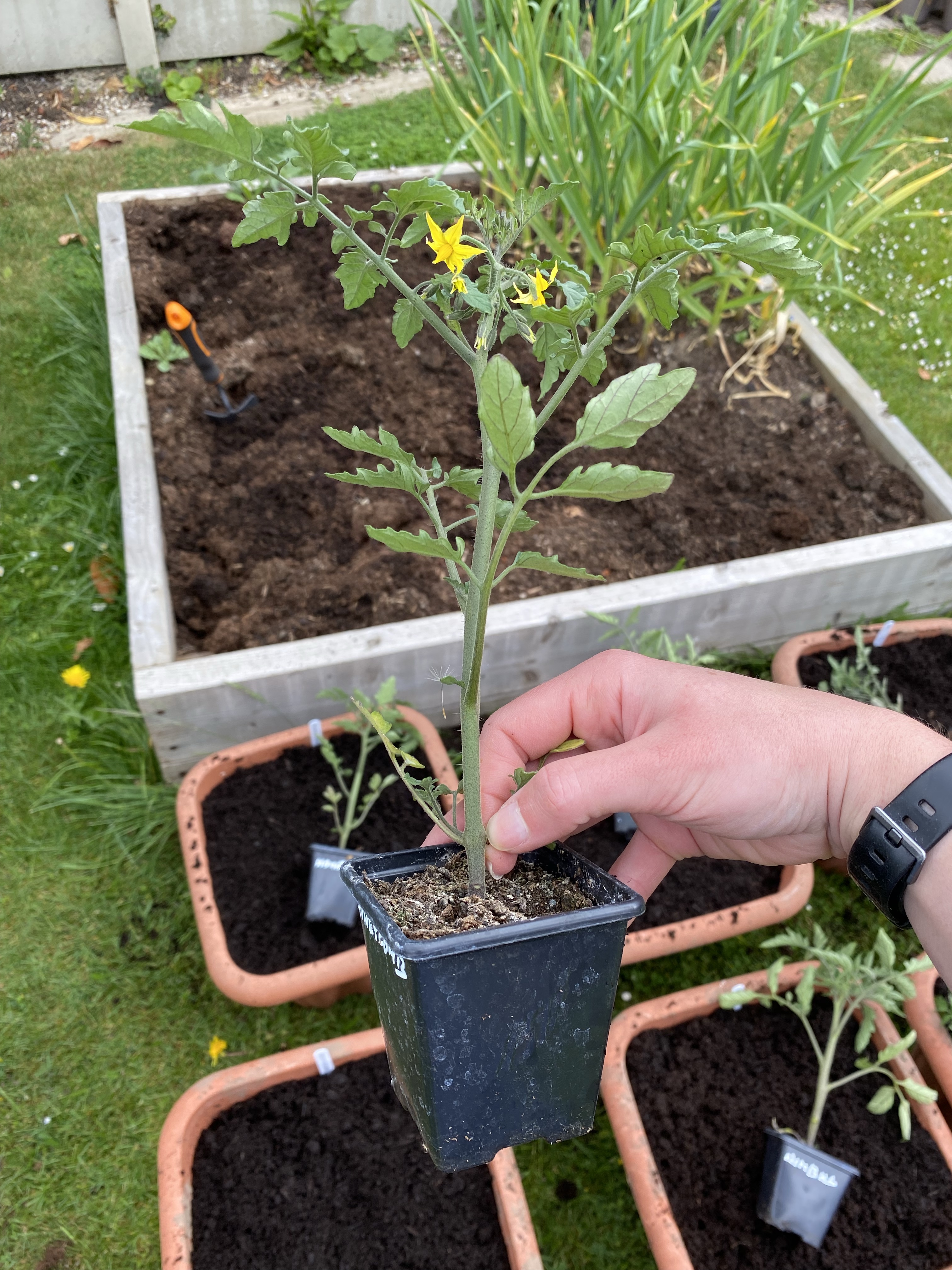 Tomatoes sprout roots from their stems which will aid their uptake of water and nutrients. Therefore, we bury part of the stem to try and encourage this to happen and build a stronger plant from the beginning.