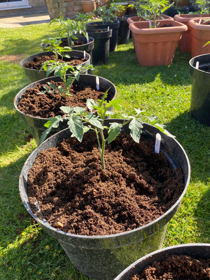 We planted each of our tomato plants out into a 10 litre pot and then gave them a good watering to settle them in. We also stuck a label in each pot so we don’t get the varieties confused. Although we recognise most of them, we’re not so sure about some of the new varieties!