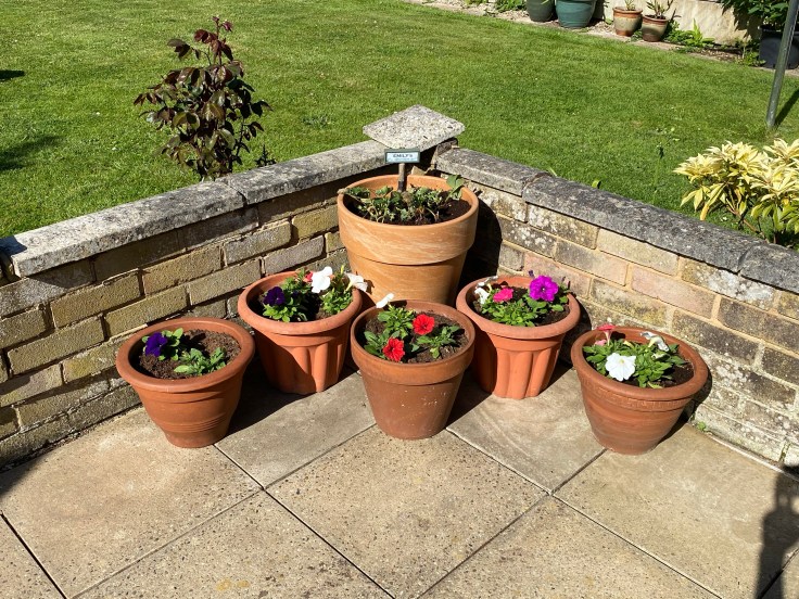 We had some glorious weather last Saturday – lovely blue skies and sunshine. So we took the opportunity to move some of our vegetable plants outside, and to pot some others up.