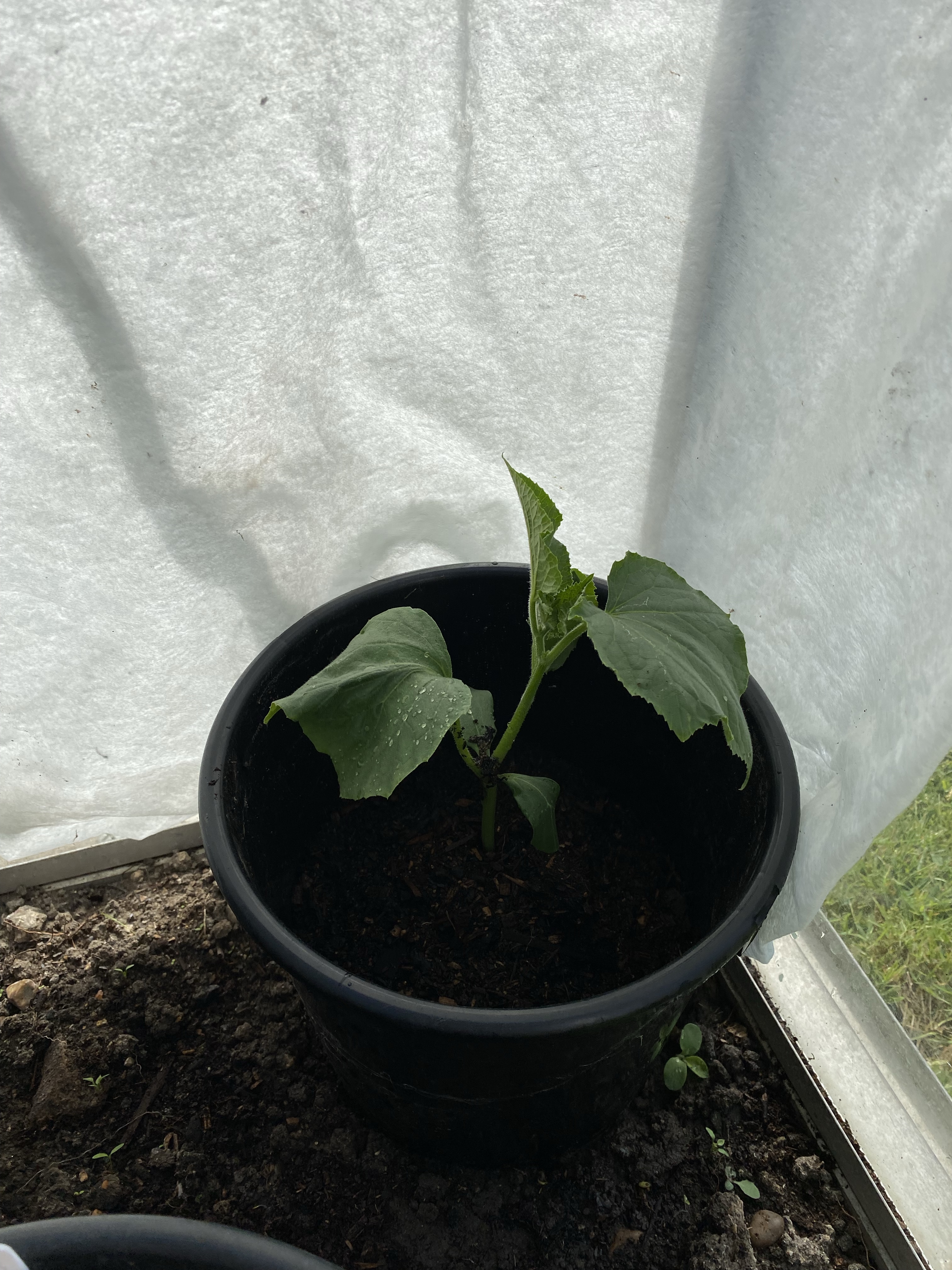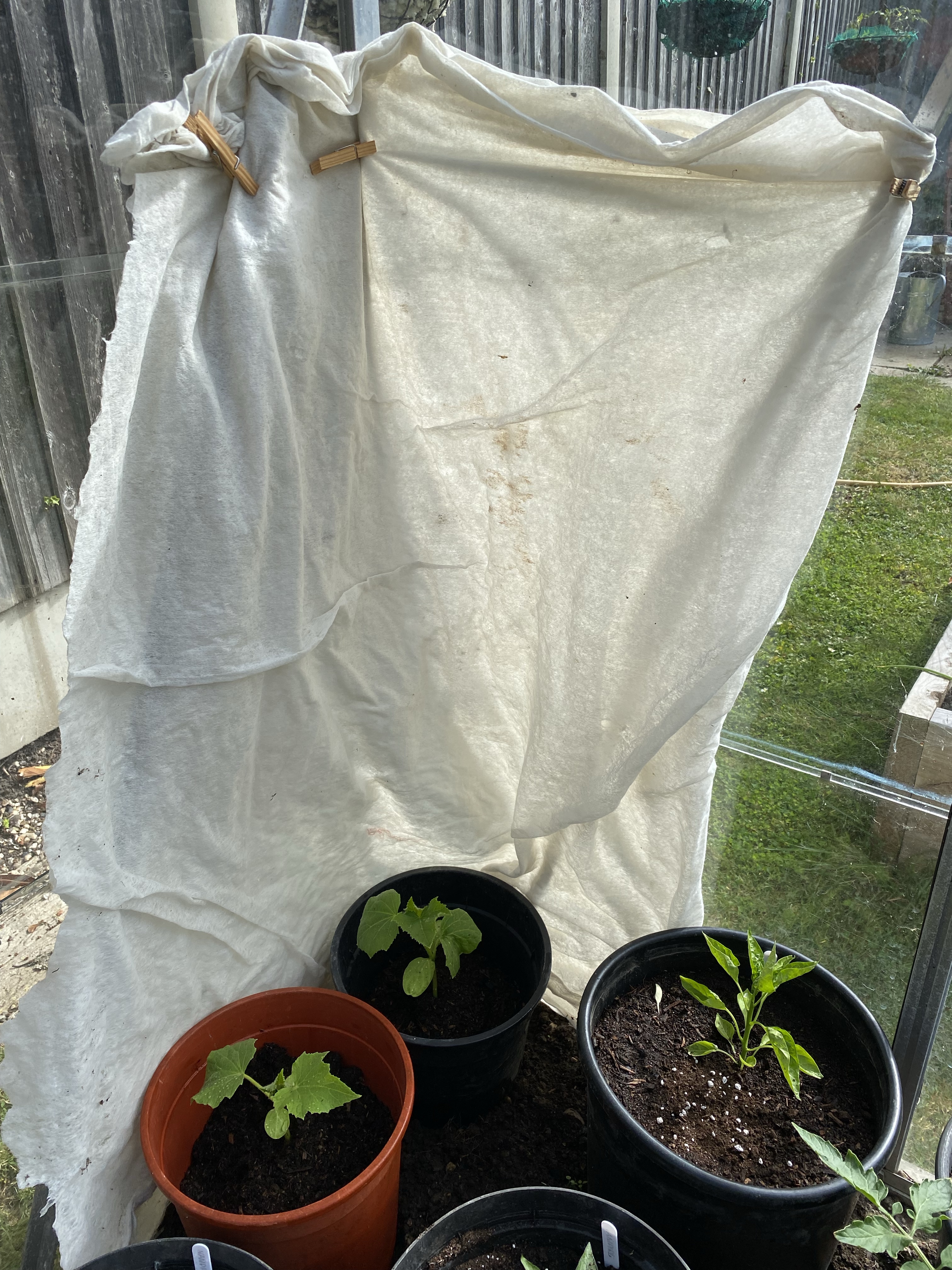 Next up we have our cucumbers. These are Mini Munch, Nimrod and Salt ‘n’ Pepper. As it was quite warm over the weekend, we shaded the young plants with some fleece that we pegged to the greenhouse structure. It seems to be working so far, so fingers crossed it stays that way.