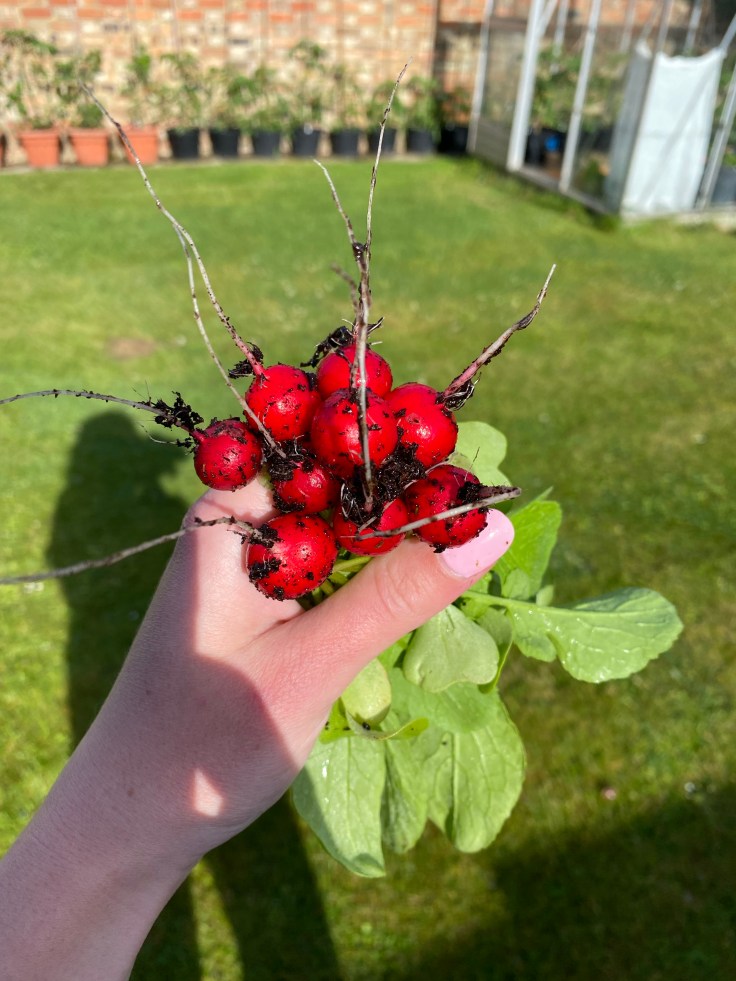 We also had our first radish harvest of the year. These are Rougette radishes – and very nice they are in salad too!