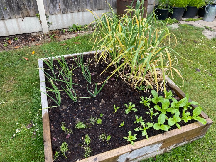 In our little raised bed, we’ve got the garlic, red onions, fennel, chop suey greens and pak choi. It’s amazing how quickly the pak chois are growing!