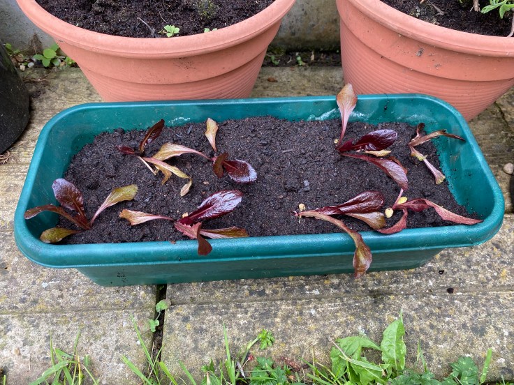 Our latest sowing of red lettuces are just ready to plant out. They don’t take up too much space and so this batch have been planted out in a little trough.