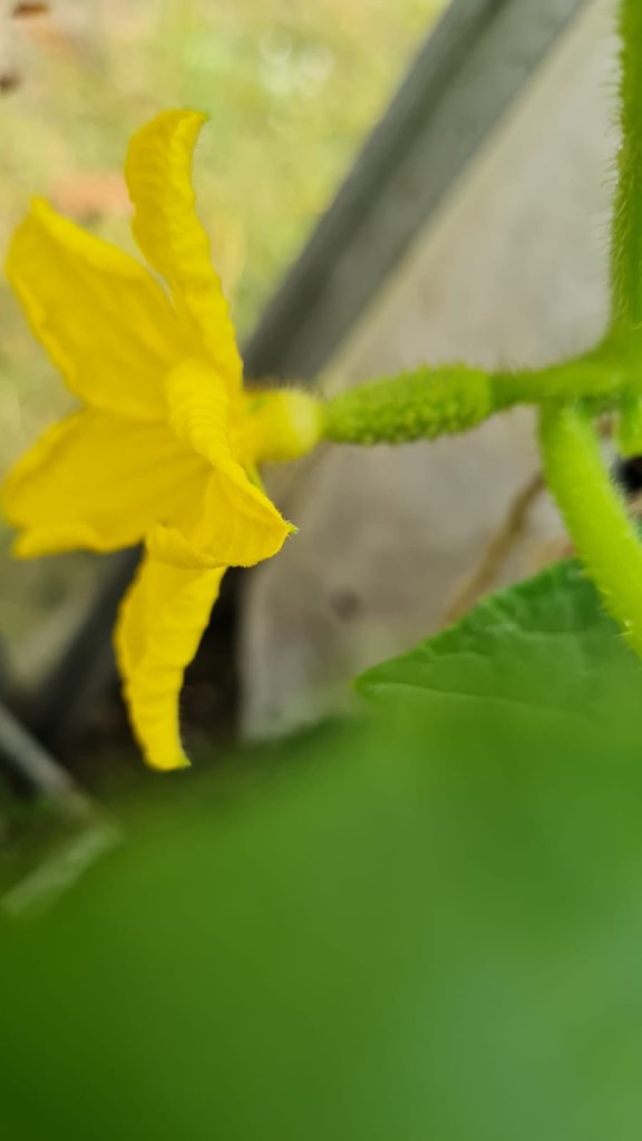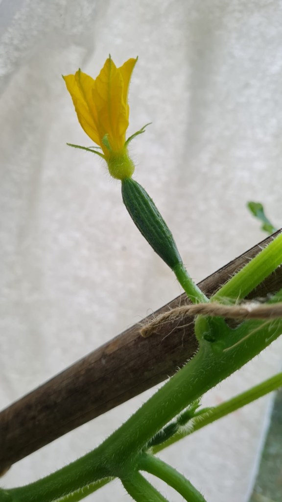 We also pinch out all the side shoots to allow just one main vine for the cucumbers to grow off.