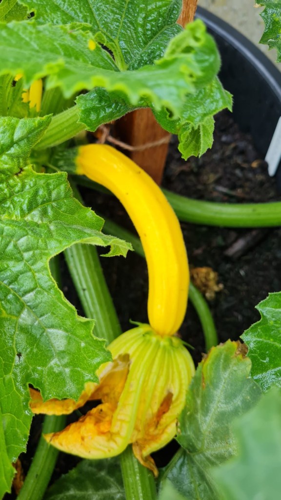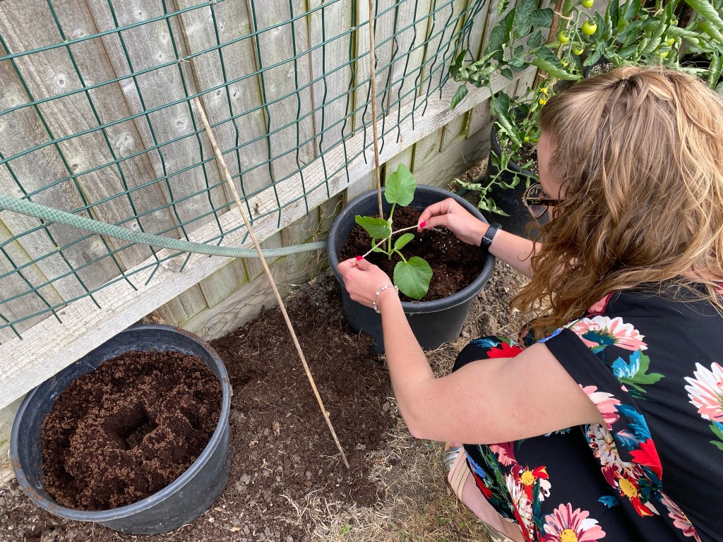 As with the cucumbers, each courgette plant is staked to support the plant as it grows. This allows us to grow our courgettes in a smaller space as they grow upwards out of their containers rather than trailing around the garden. Again, we tie each courgette plant up the stake every 4-6 inches.