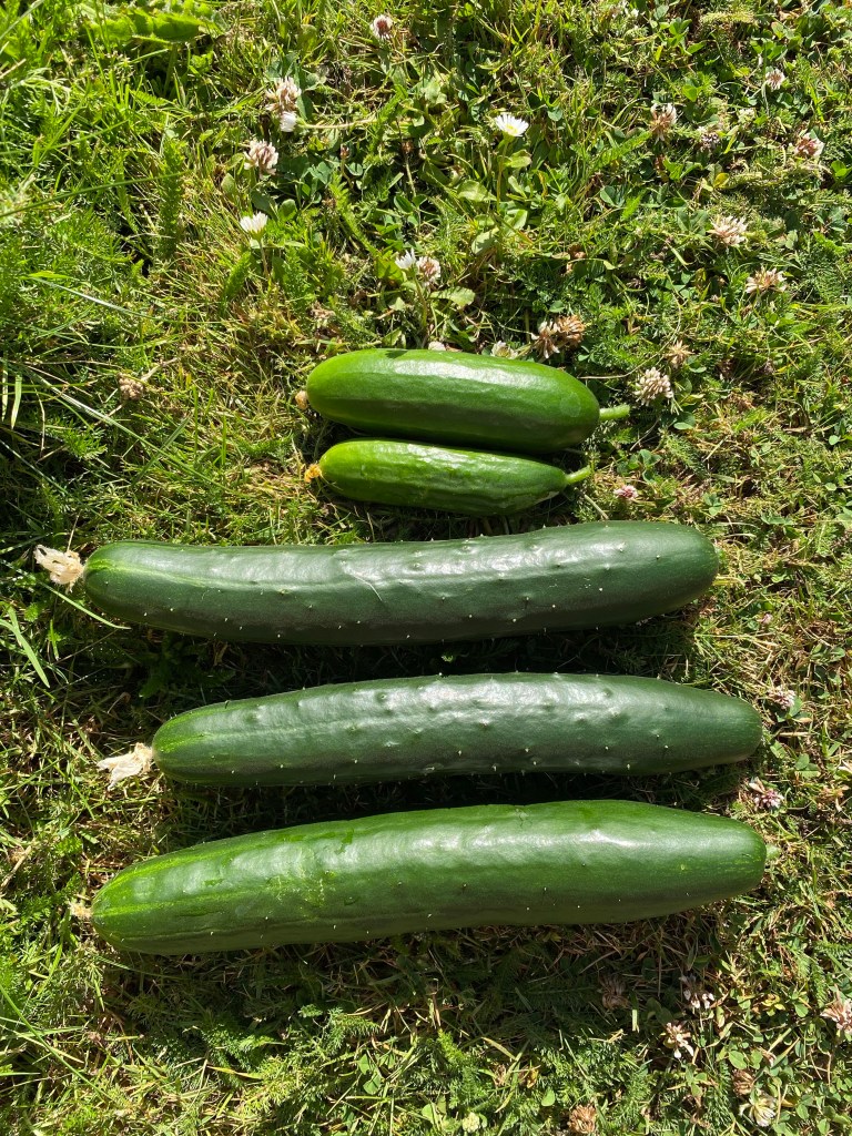 And here are some of the finished products. As you can see, we have all sorted of shapes, sizes and colours of cucumber and courgettes going on in 2022 and they are all very tasty!