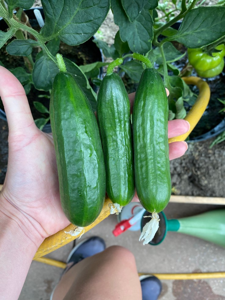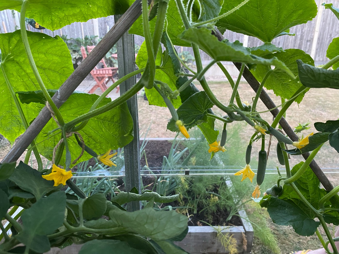 The plants really are prolific. You can see from the photo below just how many fruits there are on each plant, and they are quite close together which means you can pack more fruits into a smaller space. Lots of cucumbers will form fruits like this but then not all of them survive once one or two start to swell. That doesn’t seem to be the case for the Mini Munch and Nimrod though – they seem to be able to support lots of fruits at once. We’ll have to try and remember to do another post to show what we mean as the fruits start to grow.